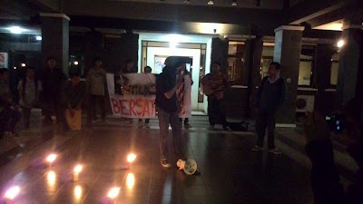 Mahasiswa yang tergabung dalam Front Mahasiswa Universitas Brawijaya menggelar aksi di depan Perpustakaan Pusat Universitas Brawijaya, Rabu (28/10)