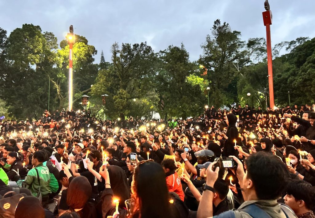 MALANG, PERSPEKTIF – Sejumlah pengemudi ojek online (ojol) bersama koalisi masyarakat sipil menggelar “Aksi Solidaritas Mimbar Bebas & Doa Bersama” di Alun-Alun Merdeka, Malang, pada Jumat (29/8). Aksi yang berlangsung dari pukul 15.00 hingga 18.00 WIB ini ditujukan untuk mengenang Almarhum Affan Kurniawan, seorang mitra pengemudi Grab yang tewas terlindas mobil polisi saat terjadi aksi di Jakarta sehari sebelumnya, serta seluruh korban kekerasan oleh aparat kepolisian.