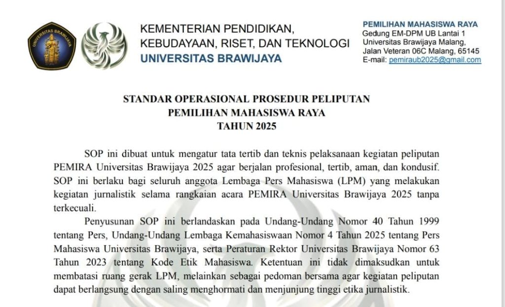 Malang, PERSPEKTIF — Regulasi peliputan untuk Lembaga Pers Mahasiswa (LPM) diangkat oleh panitia mahasiswa Pemilihan Mahasiswa Raya (Pemira) Universitas Brawijaya (UB) dalam konferensi pers pada Selasa, 4 November 2025. Sosialisasi regulasi peliputan menuai polemik dan keberatan dari kalangan LPM yang menilai aturan larangan menulis berita negatif dari panitia Pemira akan membatasi ruang gerak pers. Kontradiksi argumen disampaikan oleh panitia dosen Pemira yang menilai seharusnya LPM tetap independen dan boleh menyampaikan kritik.