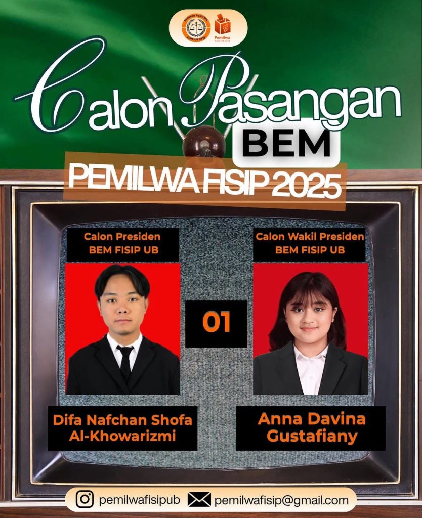 Malang, PERSPEKTIF — Pemilihan Mahasiswa (Pemilwa) Fakultas Ilmu Sosial dan Ilmu Politik (FISIP) Universitas Brawijaya (UB) yang berlangsung pada Rabu (19/11/2025) menghadirkan fenomena calon tunggal. Pasangan Difa Nafchan Shofa Al-Khowarizmi dan Anna Davina Gustafia maju sebagai satu-satunya calon Presiden dan Wakil Presiden Badan Eksekutif Mahasiswa (BEM) FISIP, berhadapan dengan kotak kosong.